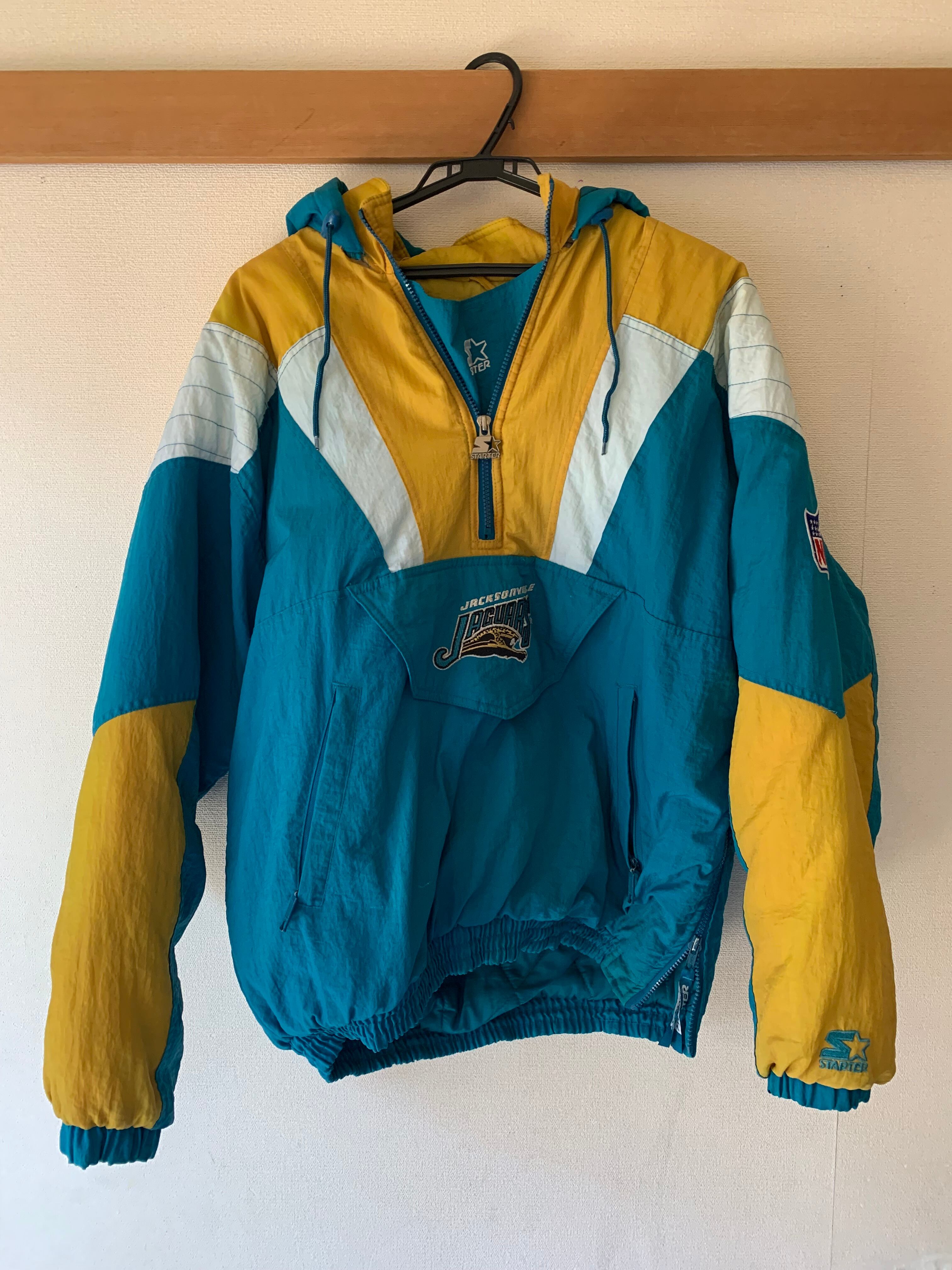 STARTERのナイロンジャケットが入荷致しました。チームはNFLのジャクソンビルジャガーズです。アノラックのようなデザインにナイロン生地で内側は中綿素材になっているため暖かく着ることが出来ます。90s好きには特にお勧めできるサイズ感です。汚れやほつれは見受けられます。